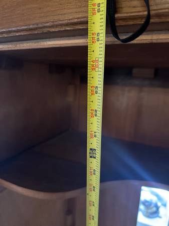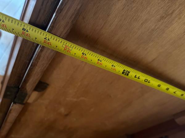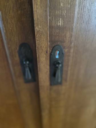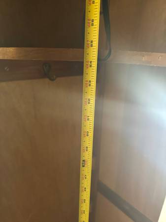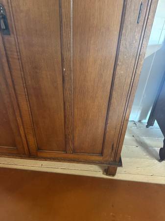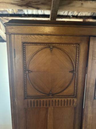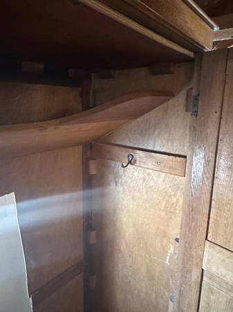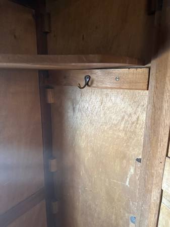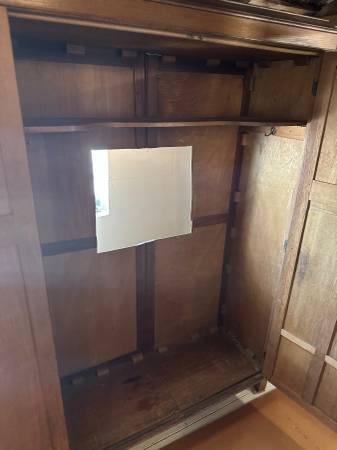 A true antique, yet very functional and practical. Great dresser wardrobe to hang clothes. Removable shelf. Back was cut out years ago maybe used as an entertainment console. Solid wood, quarter sawn oak