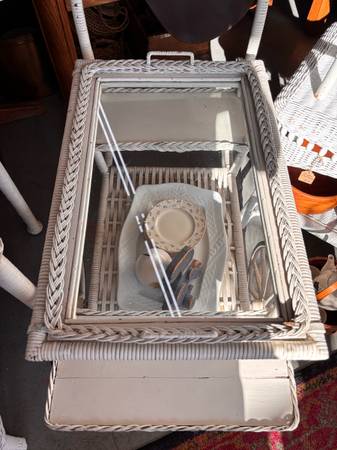 Absolutely charming vintage tea cart with removable glass tray white rattan has large wagon wheel style wheels that roll nicely. This is a very cute piece! Handle 34.5 H Cart 25.5Hx16Wx32L