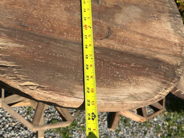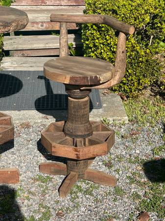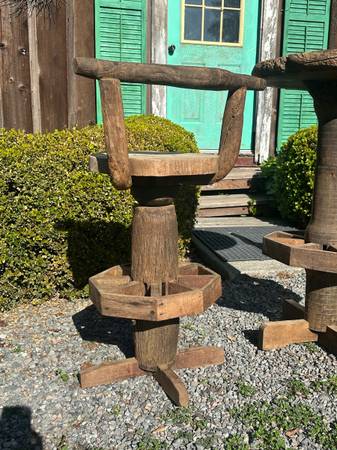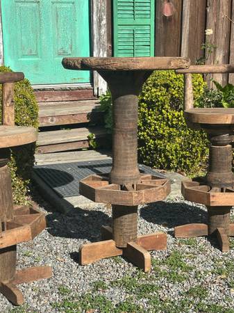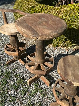 Made of reclaimed teak wood. Swivel seat bar stools. Would look great in a man-cave, mini pub, outside under patio, in a lodge, cabin or winery, western kitchen etc. or use in the house in corner for a breakfast nook