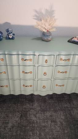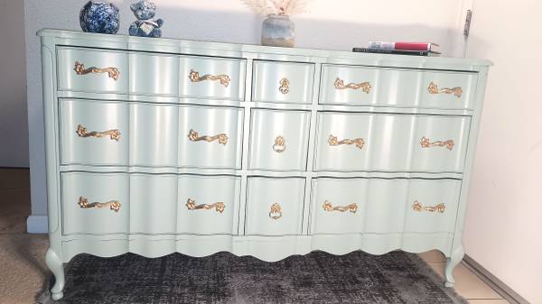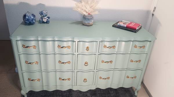 BEAUTIFUL REFURBISHED 9 DRAWER FRENCH DRESSER! MOSS GREEN COLOR! REAL WOOD! ORIGINAL HARDWARE! DIMENSIONS 57 AND A HALF INCHES WIDE 34 INCHES HIGH 20 AND A HALF INCHES DEEP! MUST SEE! CASH IS KING!...