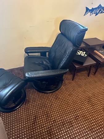 Ekornes Stressless Danish Modern Vintage MCM Mid Century Black Leather Styling Tufted Recliner & Ottoman Black leather Ekornes Stressless Recliner & Footstool In great shape High Back...