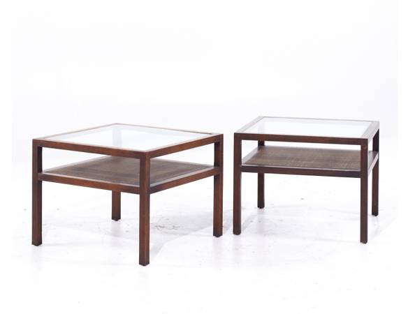 Two top quality glass top oak end tables with caned shelves. They were designed by Jack Cartwright for Founders ca. 1970. The tops feature 3/8" thick glass inserts. They're in good condition with a...