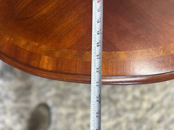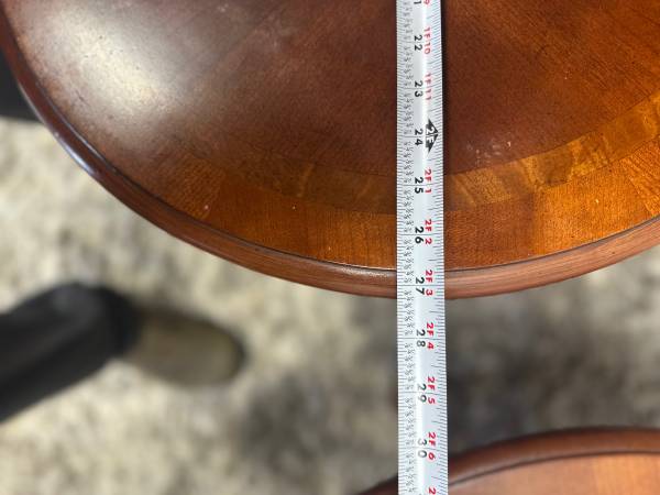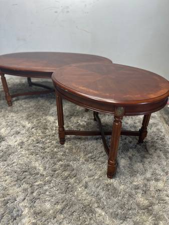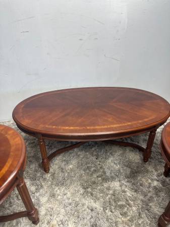 Fruitwood oval coffee table with cross stretcher base and two end side tables burl wood empire $350 for the set Coffee table 48”Lx28”Dx17”H End side tables 27”Lx23”D x21”H Furniture solid wood...