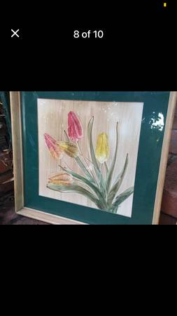 Gen (Genevieve) Matuscha was a very popular artist who worked mainly in the 1940s from her studio in Hollywood California. I can supply more photos if you like. She was renowned for her technique of finger painted watercolor florals but also did landscapes, sometimes in very unusual frames. I urge you to look her up, it’s very interesting. This particular pair are completely original, have never been opened up, in the original frames in amazing condition. The frames are 1 1/2 inches deep as was the custom of the 1940s. The price is for both pieces. Unfaded, beautiful condition. They measure each 17 inches tall x 17 inches wide and 1 1/2 inches deep. For a quick reply Please CALL or TEXT me at ** seven o seven, seven nine six, three two nine two. Located in West Petaluma. Cash only please. Thanks