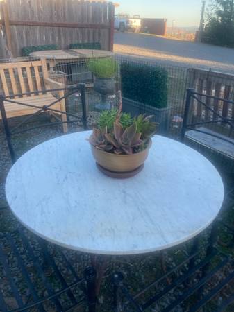 Beautiful marble table and four heavy iron chairs. Beautiful thick beige cushions included.