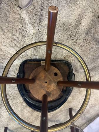 4 Mid Century Black Leather Counter Height 25” Seat Height Swiveling Barstools 360 Swivel Bar Stools In excellent condition Walnut wood legs with metal circular tube foot rest and black leather 21”...