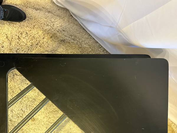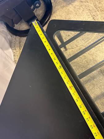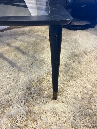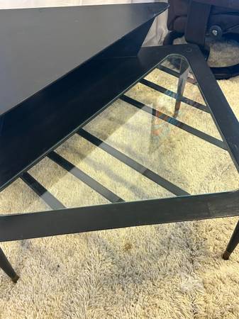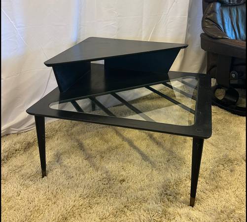 Mid Century Tiered Corner Table 32” Square Black Wood Tapered Legs & Glass Top Insert MCM 32” Square 15” Height to First Tier 7” To Second Tier 22” Height Black solid wood with quintessential...
