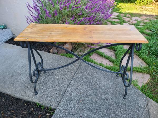 Patio Table For covered patio or porch. Fine for outside - top is removable (undo the screws) and can be replaced if needed. Metal Base and Wood Top. Excellent condition. Sturdy but not super heavy....