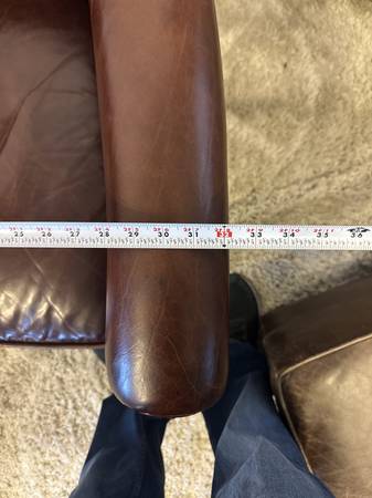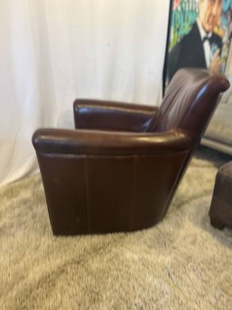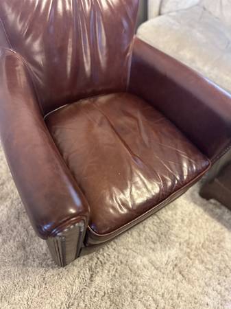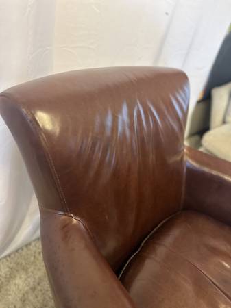 High quality leather . No major defects, smells or stains. Color is reddish brown. Petite size that does not take up to much space like many traditional club chairs. Roll arms and nailhead rivet accent on front of arms.