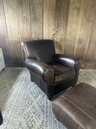 Pottery Barn / Mitchell Gold Manhattan Genuine Brown Leather Chair & Ottoman - Dark Brown 36” W 40”D 34”H