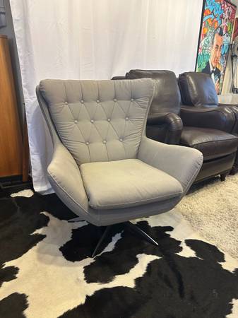 Pottery Barn Wells Tufted Mid Century Modern Wingback Swivel Chair w Brushed Nickel Metal Base
