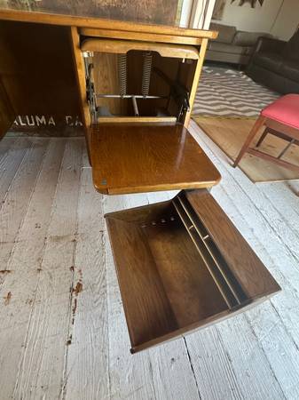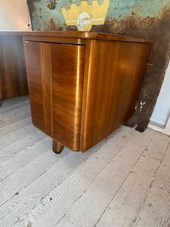 Incredible like a piece of art. Fold up door on one side with a pull out typewriter ( now use a a printer or writing surface) as well as a fole sorted storage that can pivot from that base