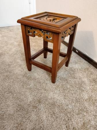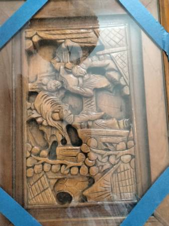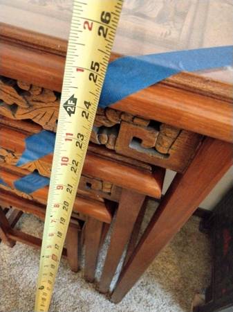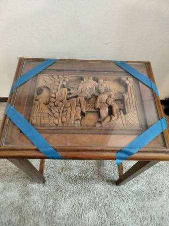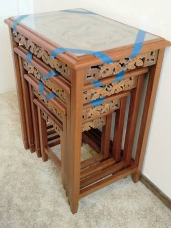 Set of Four Chinese Carved Camphorwood and Teakwood Nest of Tables, each table with elaborately carved people in village scene. Featuring Protective Glass Tops (the small table has no glass). All stable and sturdy. All with carved through aprons.
