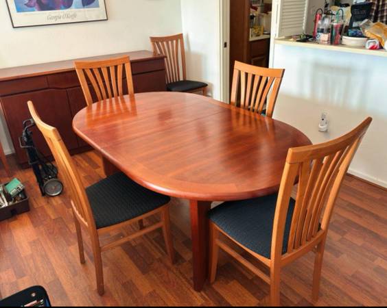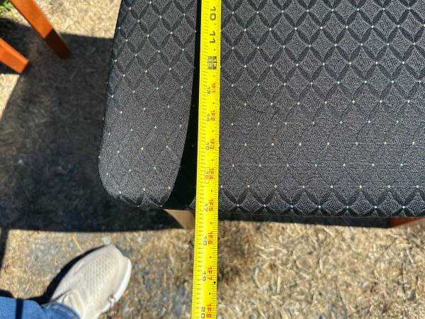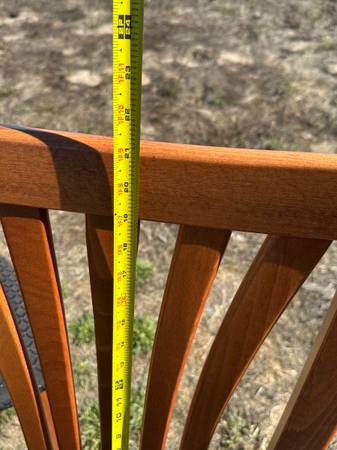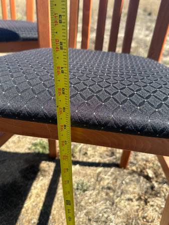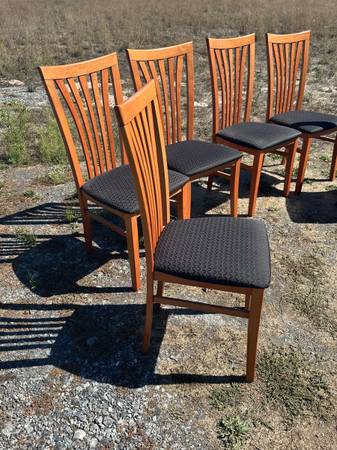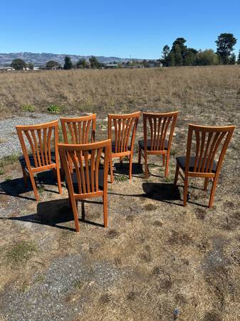Set of six Italian high back solid teak dining chairs with vertical slat backs and black fabric padded seats. Good used condition, made in Italy by IMS Measurements in photos. 39” Height 18” Wide...