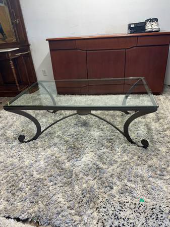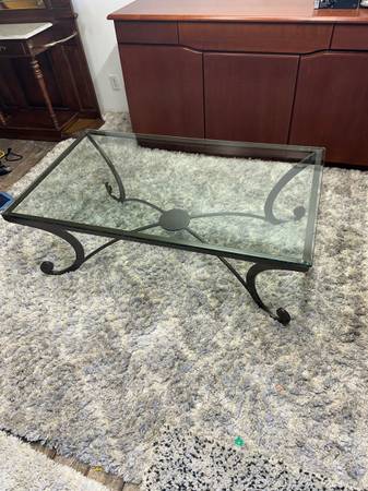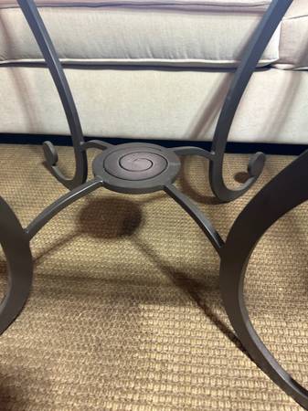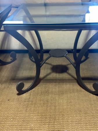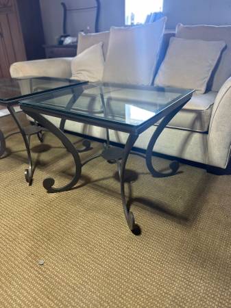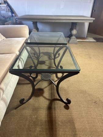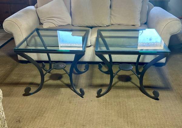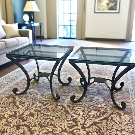 2 - Solid Ornate Wrought Iron Metal Side End Tables with Thick Glass Tops 26”x26”x22”H Extremely well built and heavy Solid metal with thick glass tops Beautiful curved legs and feet In great...