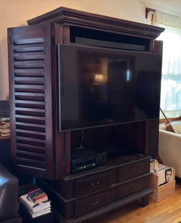We used it as our TV and stereo cabinet, and it's the centerpiece of our living room. The custom all-steel monitor mount is included and easily removed. To give a sense of scale, the TV monitor pictured is 55". A 32" monitor will fit completely inside on the shelf.