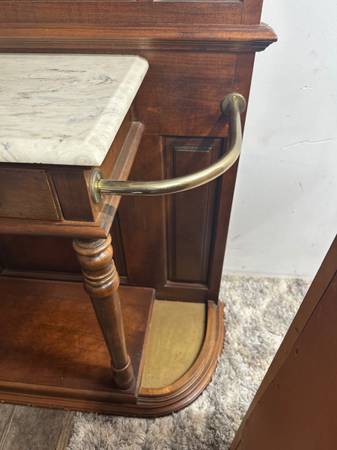 Add a touch of timeless elegance to your home entryway with this Vintage Edwardian Style Hall Tree. Featuring a built-in umbrella stand, a beautifully crafted mirror, and cane accents. It has a marble table top, brass accents and a small drawer for a functional entrance table. This piece is designed to provide both style and convenience for your foyer.