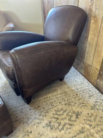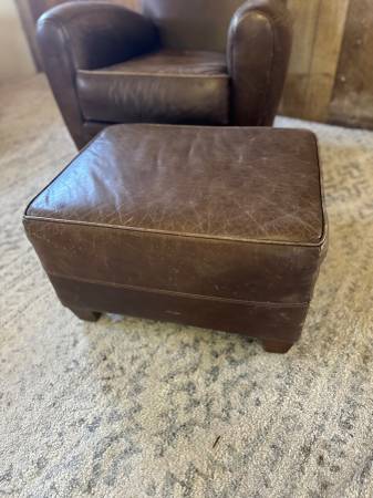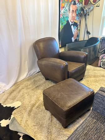Genuine Brown Leather French Parisian 1920s Inspired Club Lounge Chair with Ottoman - Great Condition / Patina
