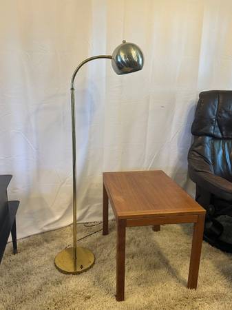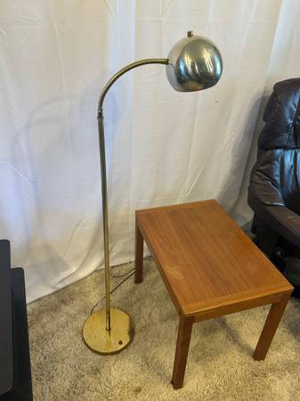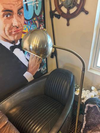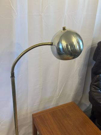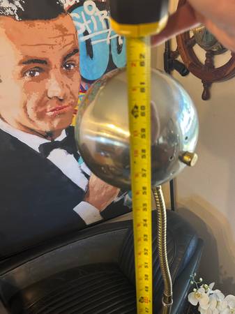 Mid-century mcm metal chrome gold brass mid century modern vintage eyeball round unique fun rare 1960’s 1970’s art deco steampunk industrial corner reading accent above chair sofa floor bedroom living room Underwriter Laboratories UL Listed