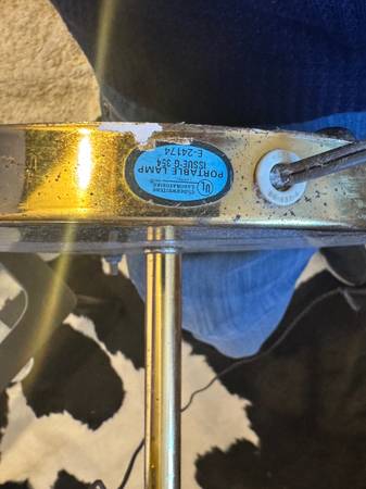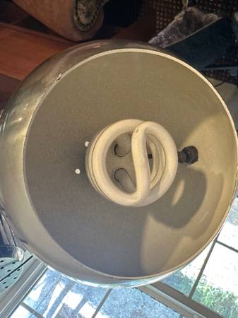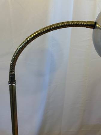 This is a great looking, versatile and and so useful adjustable brass finished gooseneck floor lamp and it is working. The lamp is 61 inches to its tallest height, the base is 10 inches in diameter and the lampshade is about 6 1/2 inches in diameter.