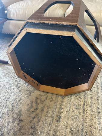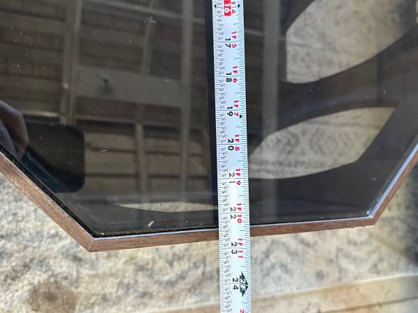 Vintage Mid Century Octagon Walnut Wood & Smoked Glass Top Coffee End Table 23”W x 19”H 1970s Mid-Century Walnut Veneer with Smoked Black Glass Top Has interesting cut outs and retro mcm...