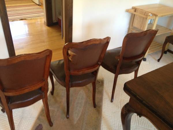 BURL WALNUT DINING TABLE AND 4 MATCHING CHAIRS. STYLE LOUIS XV. NICE CONDITION. NICELY CARVED DETAILS, HIGH QUALITY CONSTRUCTION, LARGE IMPRESSIVE TABLE, GORGEOUS BURL WALNUT. 2 EXTRA LEAVES ARE STORED IN AND UNDER THE TABLE CALLED BUTTERFLY--SEE PHOTOS.