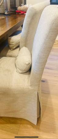 Selling 8 slip cover chairs. Chairs in great condition simply need new slip covers whicb can be any color or pattern low cost on Amazon! Dimensions 19 inch to seat 41 height of back 22 depth of...