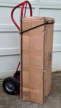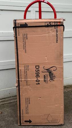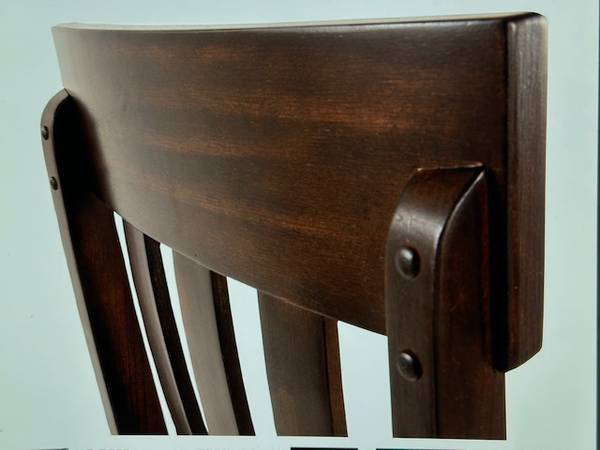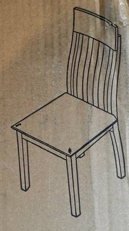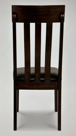 Set of 2 ASHLEY-Brand ‘Haddigan’ Rake Back Upholstered Dining Chairs, Model D596-01 have black-upholstery/dark brown wood frames, brand-new in original manufacturer’s delivery carton. These will require a modest amount of assembly w/simple tools, about 30 minutes (Tools Not Provided.) They have a clean-line, classic styling and offer modern comfort. The wide-slat, rake-back design w/lumbar curve and cushioned upholstered faux leather seat complete the sophisticated look. The overall dimensions are about 40” H x 20” W x 24” D. The seat is about 18-1/2” H, 19-1/2” W x 18” D. Stock photos of chairs are accompanied w/actual photos of the carton containing the unassembled pair of chairs. Carton w/2 unassembled chairs is available for local pick-up in San Rafael, cash, Venmo, or PayPal.