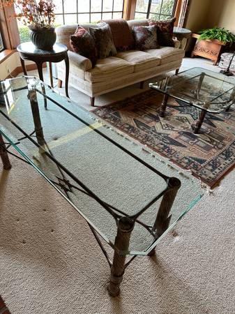 Selling pristine set for a living room! $300 for the 2 glass tables Glass coffee table: 3” by 4”-4’ x 15.5’ tall Glass taller table: 65’ long x 22in deep x 26.5in tall Also selling the Rug: 8” by...
