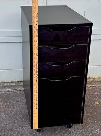 Dark Wood Grain Laminate Deskside Pedestal File Cabinet - 4-Drawer was used but well-kept, appearing virtually as new. This is a stationary cabinet with 3 box drawers and 1 file drawer. It is tabletop-sized, about 27-1/2” H x 16” W x24” D. It has notched drawer pulls rather than applied handles, giving it a very streamlined appearance. Drawer panels are finished in white laminate and mounted with metal drawer glides for smooth opening. The cabinet is NOT lockable. It sits flush to the floor, shown here on a dolly (Not included.) Similar new cabinets retail in the $300-range, a bargain here and available for local pick-up in San Rafael, cash, Venmo, or PayPal.