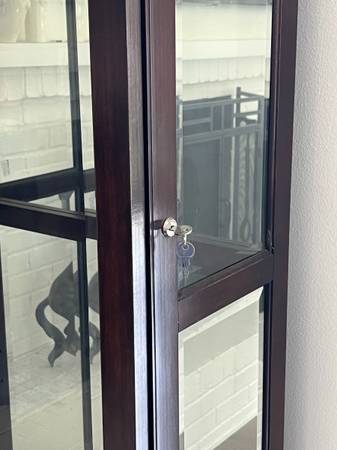 Lockable lightable Display case H 80” W 26” D 14” Has shelf hardware but is missing glass shelves