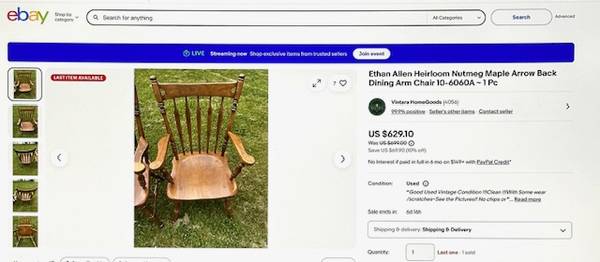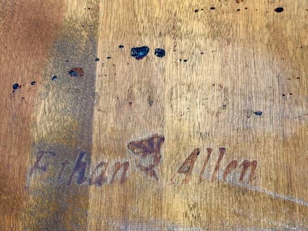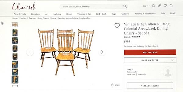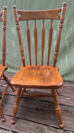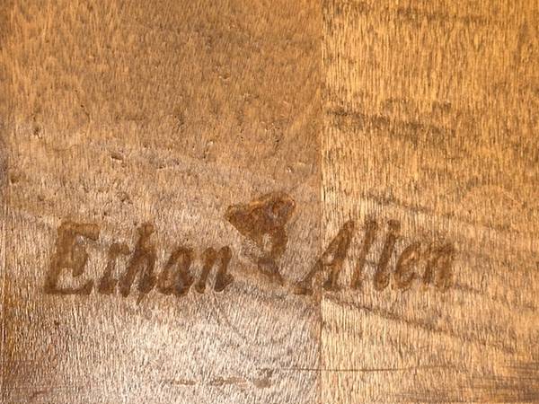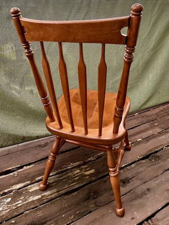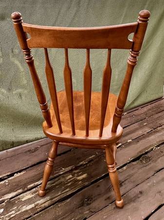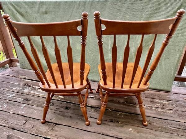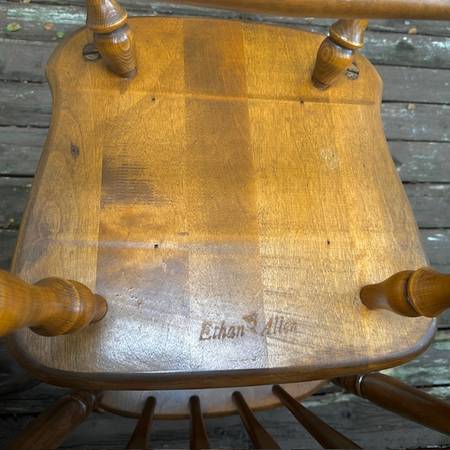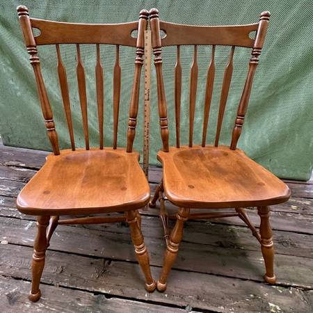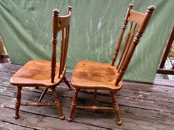 have vertical carved spindles that broadened near the top, a contoured seat, and turned legs with horizontal stretchers, all finished with a warm brown stain ‘Nutmeg.’ Both chairs are rock solid and perfect or everyday use. These are in Very Good Condition, appearing almost as new, save for a few scuffs. ‘Ethan Allen’ is impressed in the underside of each seat. The chairs are 20ʺ W × 18-1/2ʺ D × 39ʺ H, the seat about 17” H. Comparable pairs of used chairs sell for $800 - $1000, singles, for $400 - $500. A bargain here, the pair is available for local pick-up in San Rafael, cash, Venmo, or PayPal.