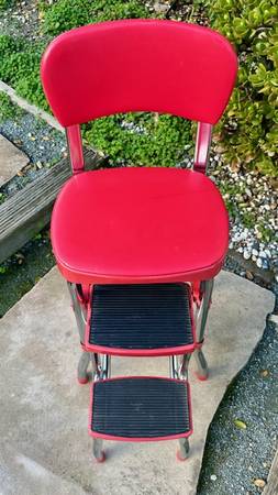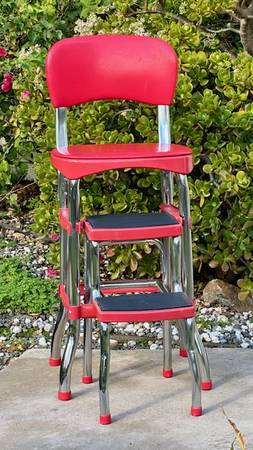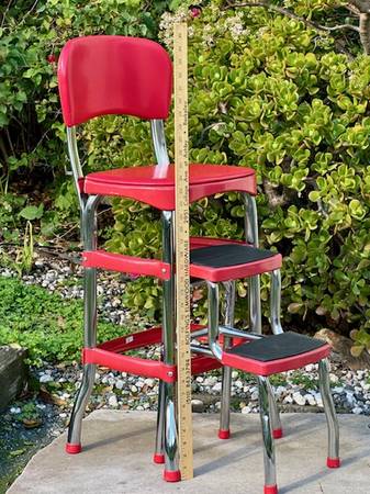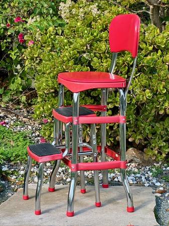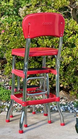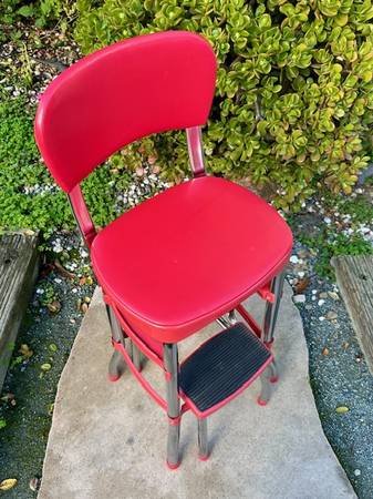 Used but well-kept, this Retro COSCO Chrome and Red Vinyl Stool w/Pull-out Steps is about 35" H x 16" W x 16" D, 23” D w/steps; the seat is about 25” H. It has a four-legged chrome base with an interior double-foot stool attached. The seat and back are upholstered in red vinyl over foam padding. It has vibrant red accents in its metal frame bracing, the pull-out step guide, and leg tips on both stool and step legs. It’s a blend of nostalgic design and practical functionality. Its sturdy construction and ease of conversion make not just a comfortable stool but also a reliable step stool. Its compact size and its utility make it suitable for kitchens, apartments, and the like. It’s available for local pick-up in San Rafael, cash, Venmo, or PayPal.