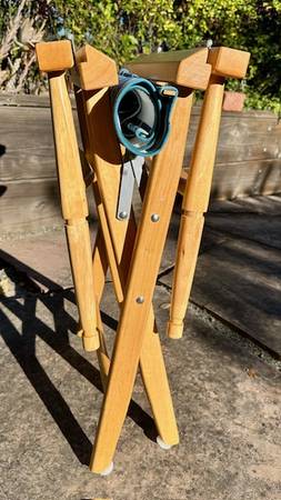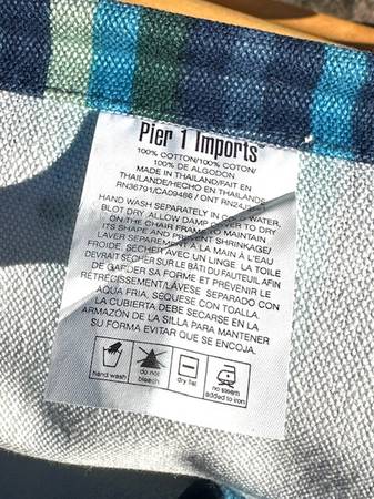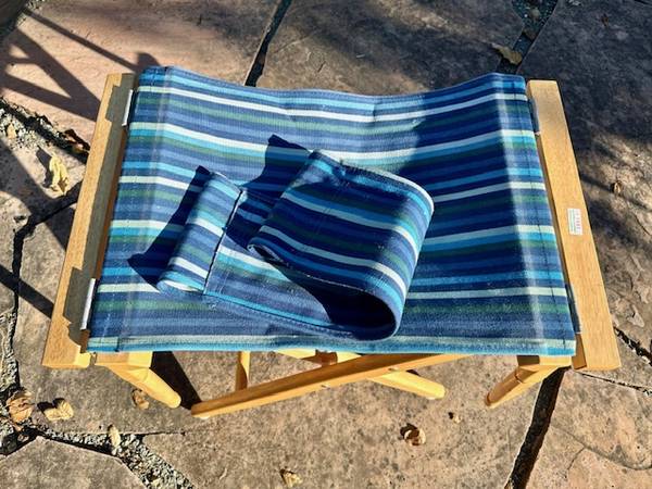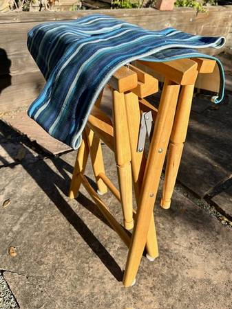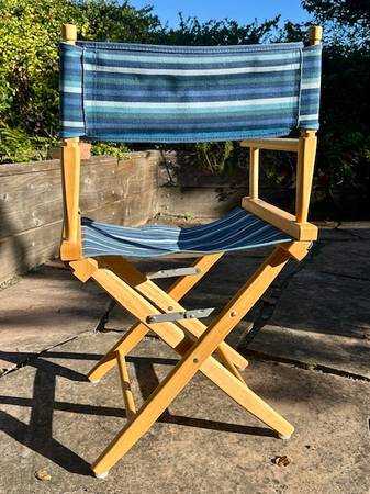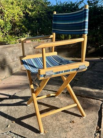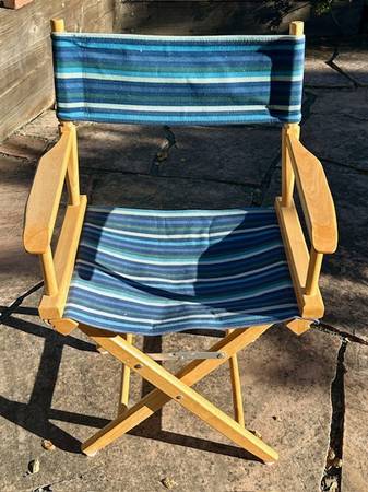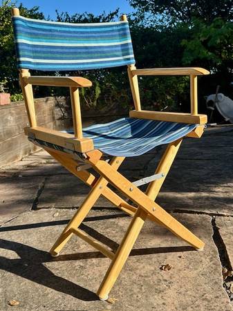 Vintage 2000 Pier 1 Imports standard folding director's chair w/blonde rubberwood hardwood frame w/blue-stiped Pier 1 canvas seat/back. Open, chair is about 36" H (to top of backrest) x 22" W x 16" D; 18" seat height. Folded it’s about 27" H x 16-1/2" D x 8" W. The chair is in very good, preowned condition, the wood frame clean and straight. The frame has a few minor scuffs but no abrasions. Hinges are firm. Nylon floor glides are in place. This is a comfortable chair, ready for patio, beach house, or any other casual seating occasion. Competitive pricing of similar vintage is in/over the $60-range, bargain here. It’s available for local pick-up in San Rafael, cash, Venmo, or PayPal.