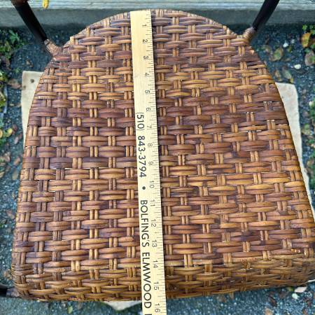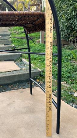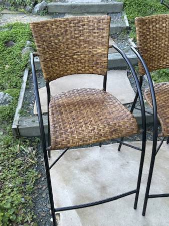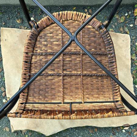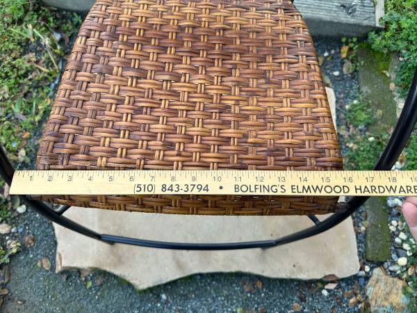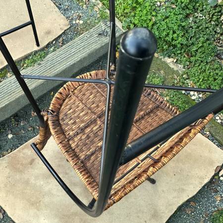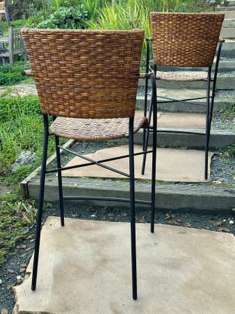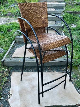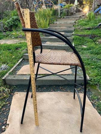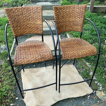 Pair of high-quality, elegantly arced bar stools wrapped in woven rattan, mounted on tubular wrought iron legs. These would be ideal for Mid-Century, bohemian, or coastal decors. They are of the 1960’s style. Each is about 19ʺW × 22ʺD × 38ʺH; seat, 24” H, arms, 31-1/2” H. Stools are stackable. They are clean, in vintage condition but no loose rattan or marred metal, although the rattan has its natural variegated finish and shows minor surface wear. Feet have domed nylon tips to glide smoothly over most floor surfaces. Stools are intended for INDOOR use only. This style is somewhat limited on internet search, particularly because of having back and arms. Pair is available for local pick-up in San Rafael, cash, Venmo, or PayPal.
