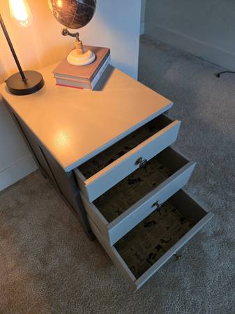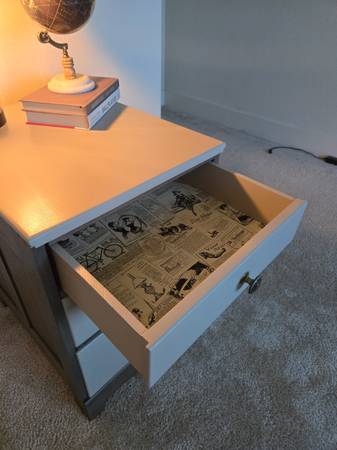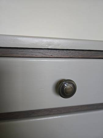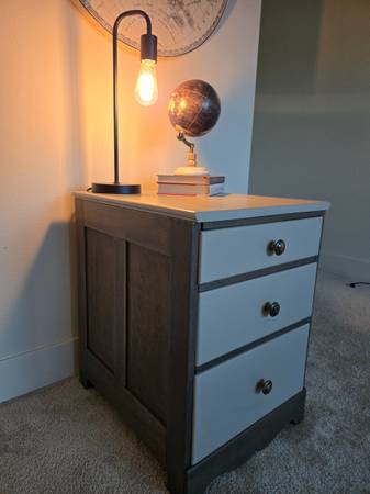 This solid wood, antique nightstand has been restored using high quality materials with great attention to detail. The two-tone is a light grey paint, and weathered grey stain giving it a classy...