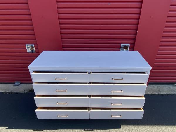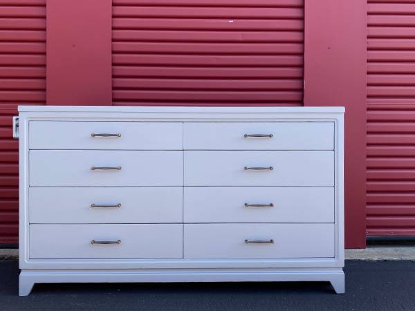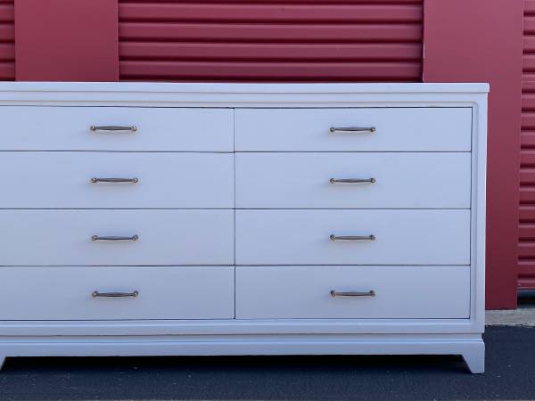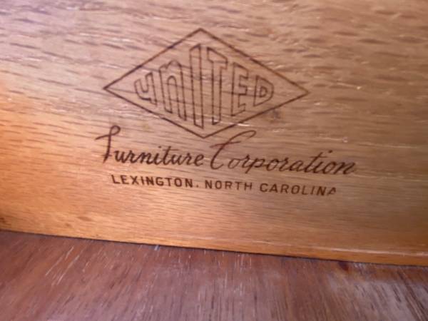 Clean lined roomy Mid-Century Modern low dresser/ chest of 8 drawers, all drawers are dovetailed and glide smoothly in and out, they are slightly graduated and have their original hardware. The dresser has been recently repainted in flat graphite. Maker is United Furniture Company. In great vintage condition.