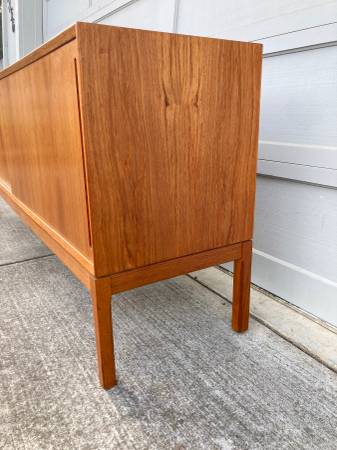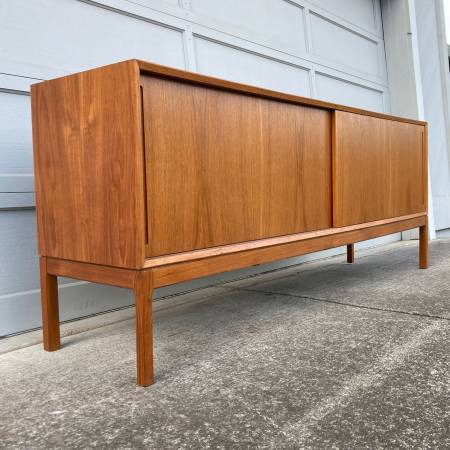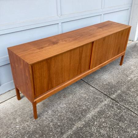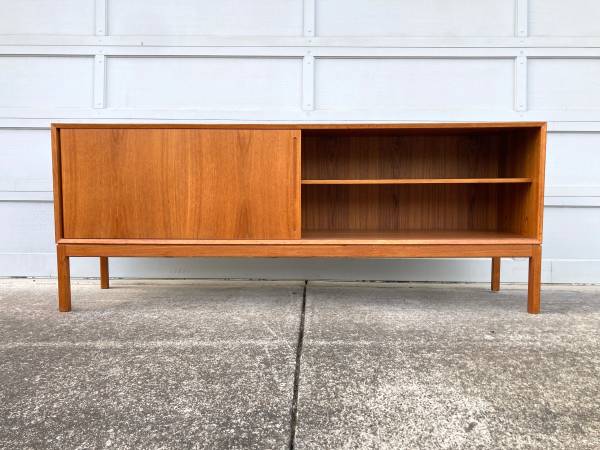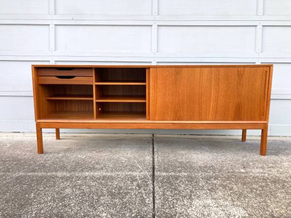Danish mid century modern teak sideboard by Aksel Kjersgaard. Made in Denmark. Great minimalist design with tons of storage. Five adjustable shelves and two drawers behind doors. It is in excellent vintage condition. Fully finished on back and can be floated in a room.