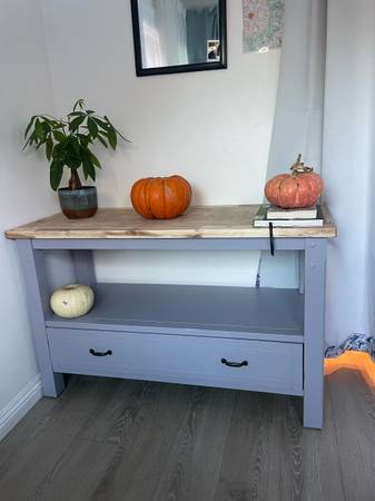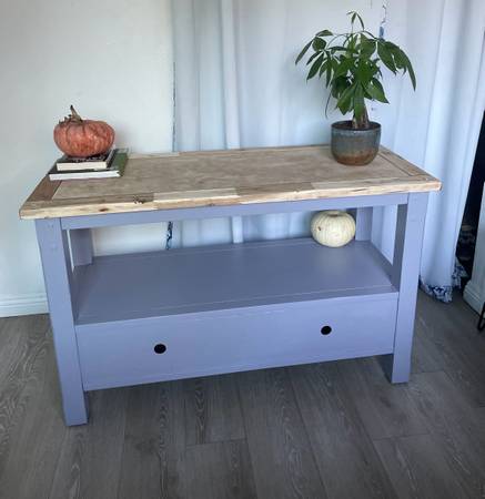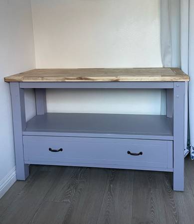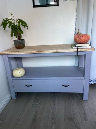 Solid oak wood tv stand with storage. Painted in Gooseberry with black hardware.