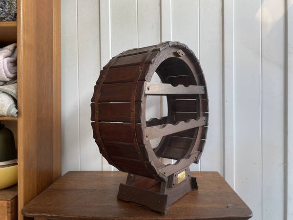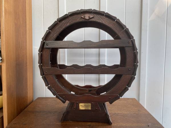 wine rack, bottle rack, freestanding wooden bottle rack, barrel style circular bottle rack, Paul Masson, counter top bottle rack