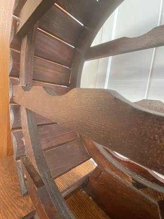 Cool decorative compact/rustic table top/ counter top wine bottle rack, wine storage, organizer for wine bar etc., holds 8 bottles, crafted in red oak barrel style, 2 metal bands hold the wooden parts in place, a brass plaque shows it was made for Paul Masson Vineyards (in Saratoga).