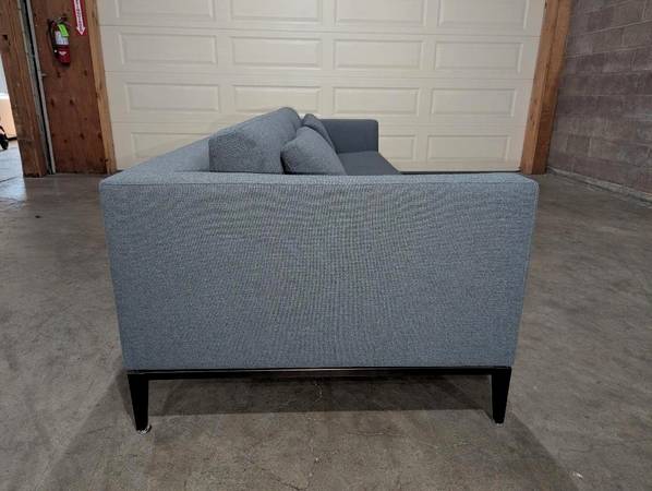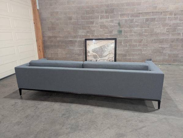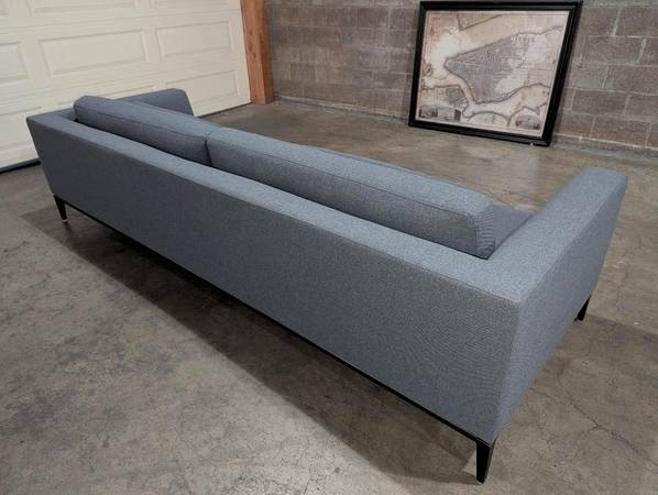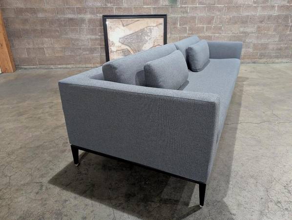 Restoration Hardware Italia Taper Arm Bench Seat Sofa upholstered in Charcoal Italian Merino Wool Velvet with Down-Feather cushions and Burnished Bronze Metal Base.