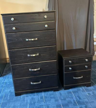 Selling Ashley Furniture Queen Bookcase Headboard with Footboard and Rails. Five Drawer dresser and the accompanying Two Drawer Nightstand. All three pieces are in almost new condition. Dark brown distressed finish with large drawers that provide a ton of space for your belongings. Knobs and pulls with satin nickel-tone finish give this dresser a neat touch of shine. Made of engineered wood and veneers.