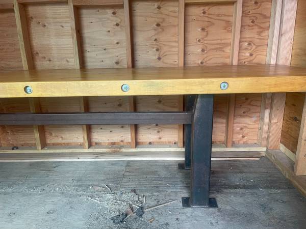 Beautifully commissioned Eastern Pine laminated dining room or office table with custom steel leg support. Barrel nut cross dowel. One of a kind. Top is solid clear pine with finger joint detail. Base is black powder coated steel, fully welded-built for decades of use. Works as studio desk, drafting table, dining or commercial piece. Bolted hardware and exposed grommets give it a clean, minimalistic industrial look