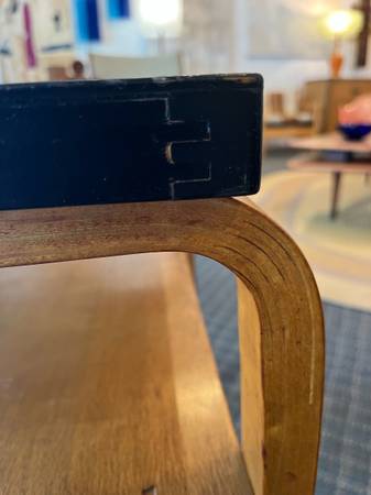 This an early Aalto side table for Artek, circa late 40’s- early 50’s. Original black to on bent beech frame.