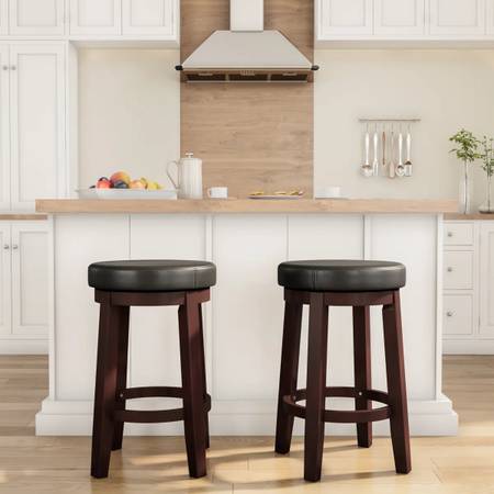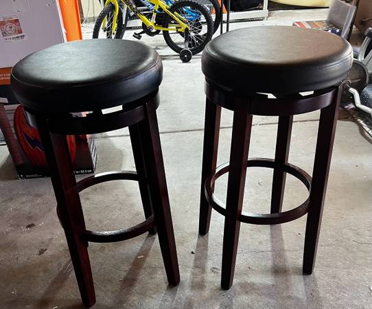 26” tall counter stools with faux leather upholstery and dark wood frame. Can support up to 350lbs