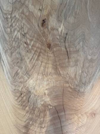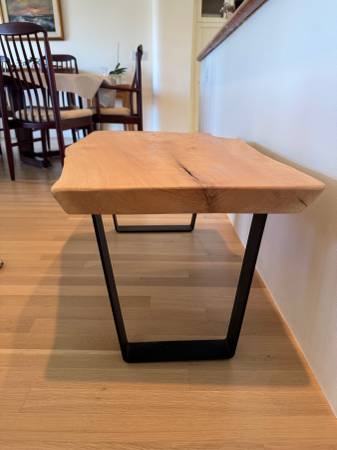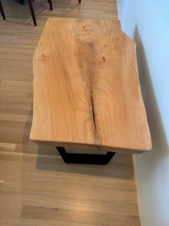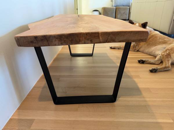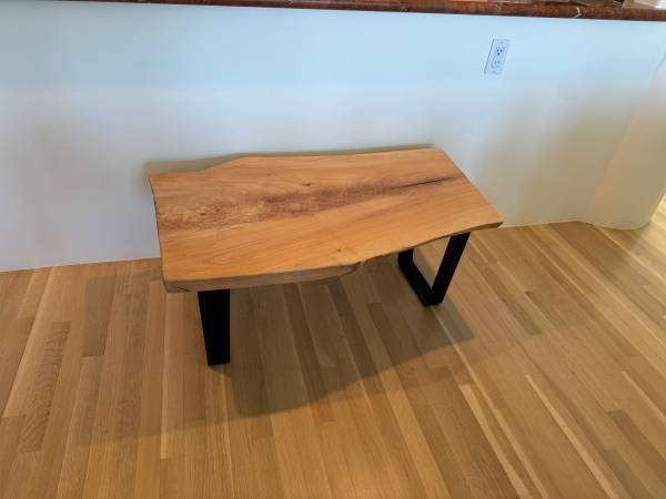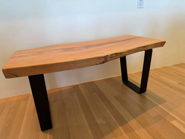 Made of Butternut wood with powder coated steel legs and a light oil finish. Dimensions are 38" long and 24" wide. The height is 16.75" and the slab is 2" thick.