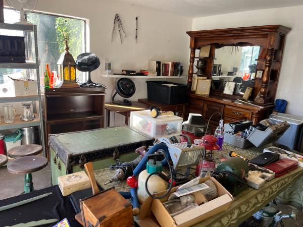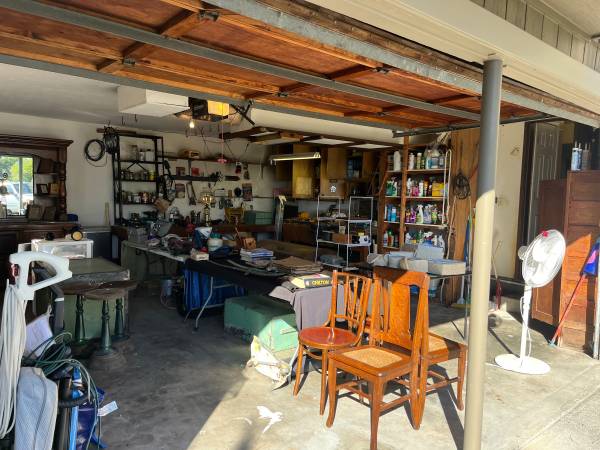 garage~ old, solid wood, extra large chest, nice brand, new portable ramps, 8 feet, handle tools, tons of chemicals and cleaning supplies, light fixtures, lightbulbs, fishing box, table, saw, hardware, beautiful, solid, wood, hutch, books, records, antique side tables, antique chest, lanterns, old newspapers, pioneer, stereo system, vacuums, antique chairs, fans, hand tools, cleaning tools, and so much more!