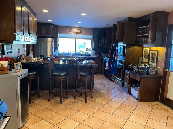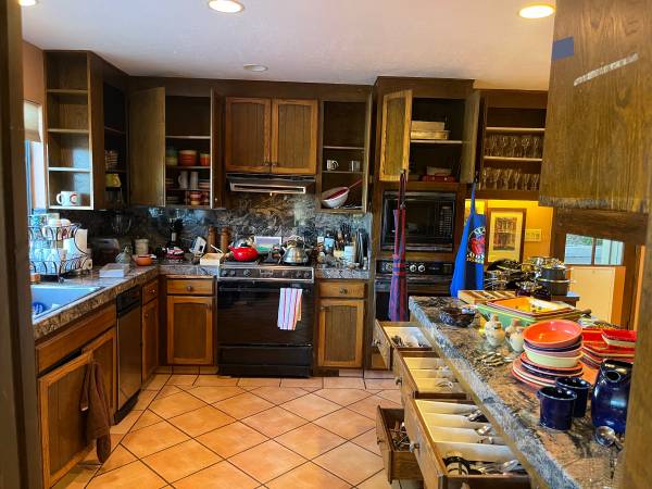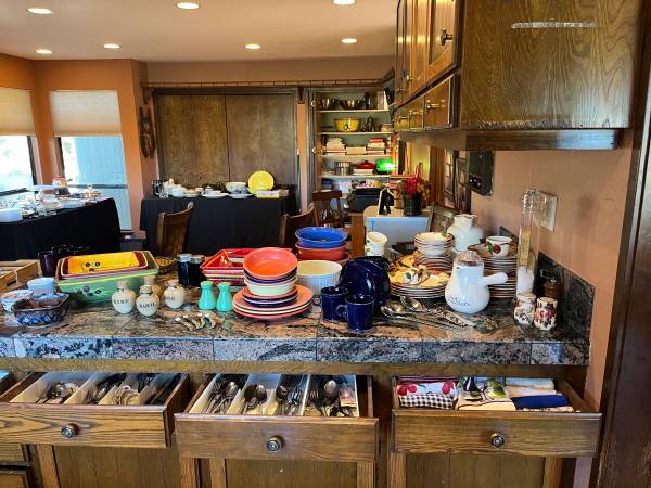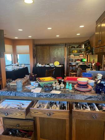 Kitchen~ Franciscan apple set, fiesta wear, lots and lots of serving pieces, pottery, multiple sets of utensils, knives and silverware sets, flatware, pots, and pans, tons of drinking glasses and stemware, Italian red wine glasses, Waterford crystal glasses, Ralph Lauren drinking glasses, depression glass, cranberry glass, danish modern Lazy Susan, danish serving pieces, Fenton glass, nippon, collection of decanters, cut, crystal, decanters, tea, pots, cups, and saucers, Marano glass, counter height barstools, HALER wine refrigerator, bakeware, huge stock, pot, air fryer, crockpot, cookbooks, electric wok and so much more!!!!