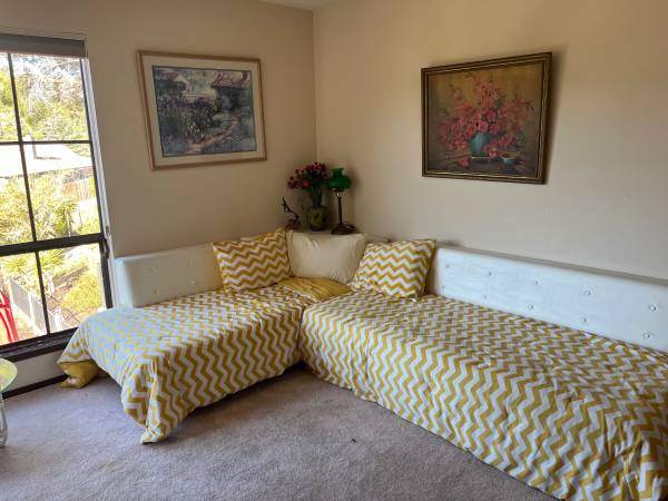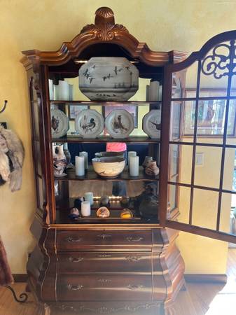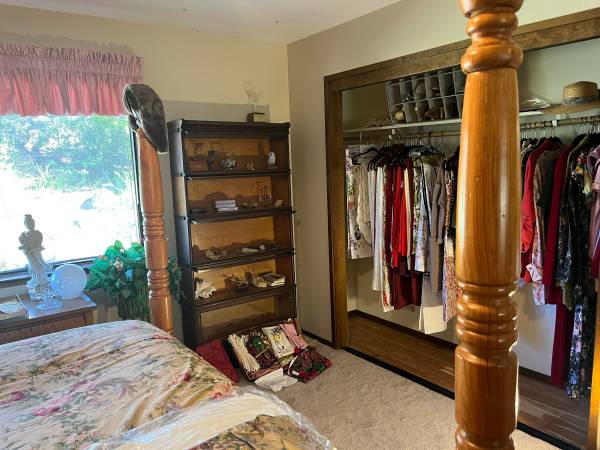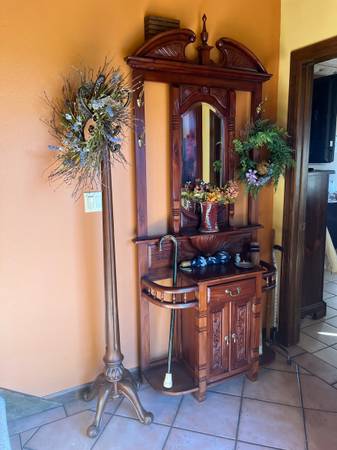Furniture~ tons of beautiful antique side tables, shelves, Bombay style solid wood hutch, dining table, nice low buffet, bookcase by hail, beautiful hall tree, two pedestal coat racks, tall skinny chest of drawers,mission style bookcase, antique dressers, antique soda counter stools, four poster queen bed, antique sewing machine, ultra modern wood chest, antique oak lawyers bookcase, vintage bookcase, desk, antique rocking chair, side table, small oval, coffee table, 2 twin beds/ low sectional couch, and more!